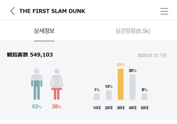 韓国人「日本映画スラムダンクの韓国観客の性別・年代を調べた結果」→「40代が一番多いと思ってたんだが・・・」「30代もすごく漫画読んでたよw」「映画館で久しぶりに心臓がドキドキしたわ(笑)」Image:cafe daum