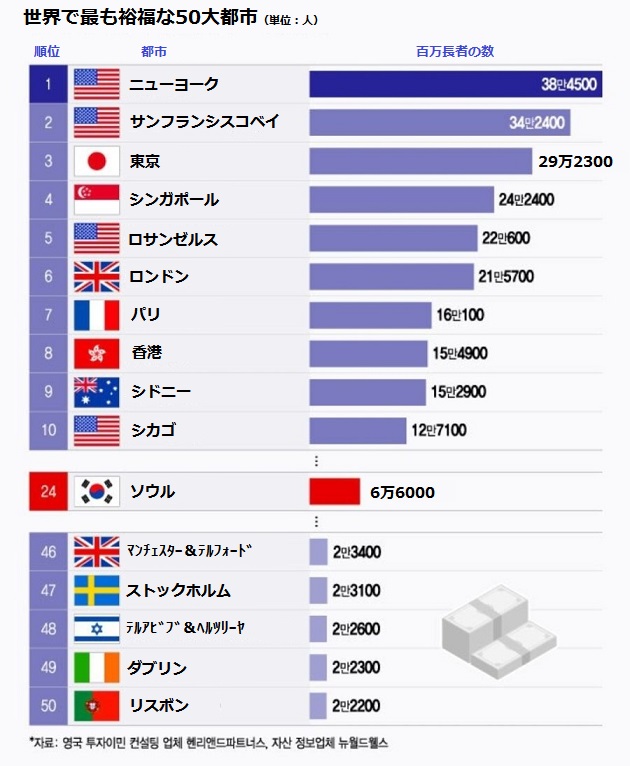 東京と人口数はほぼ同じなのに百万長者数は5倍の差があるね