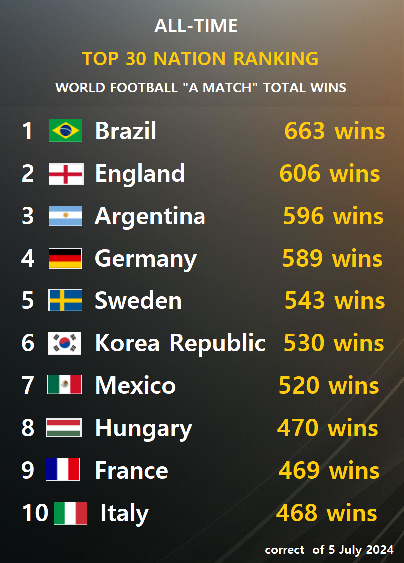全世界国家代表“Aマッチ競技勝利”歴代通算ランキングだ