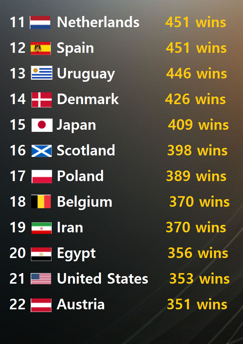 リーグ戦みたいにランキング全ての国と総当たりで対戦した勝ち数とはいえないから意味の無いランキングでは?
