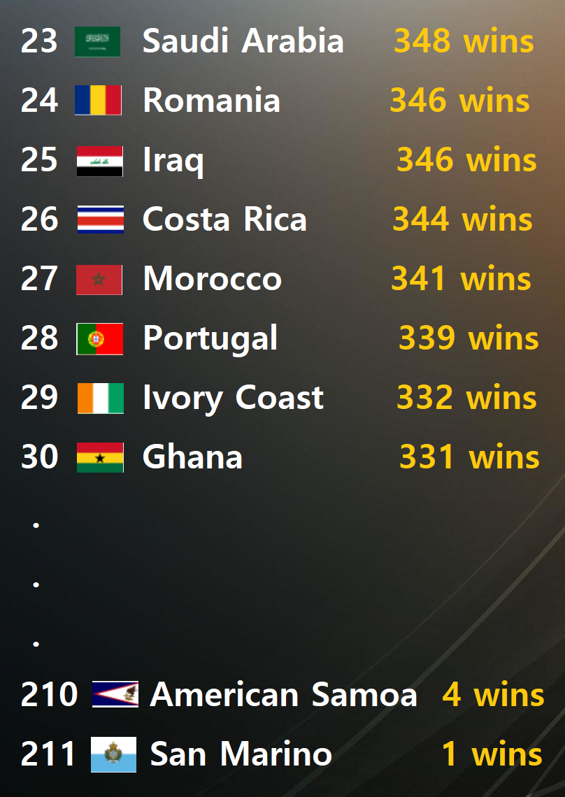 韓国人「サッカー国家代表、国別Aマッチ通算勝利数ランキングをご覧ください・・・」→「」