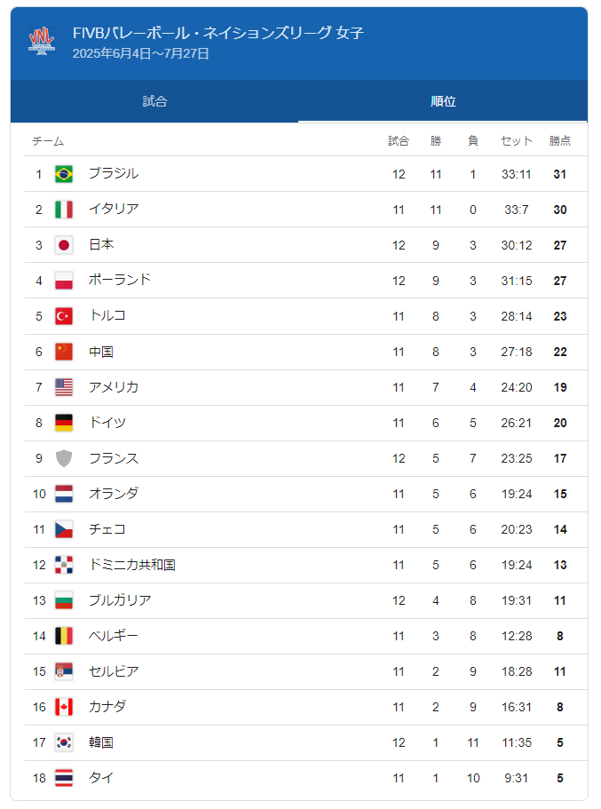 もちろんカナダの方がさらに上ではあるけどVNLの中だとそのカナダも弱い方だしな