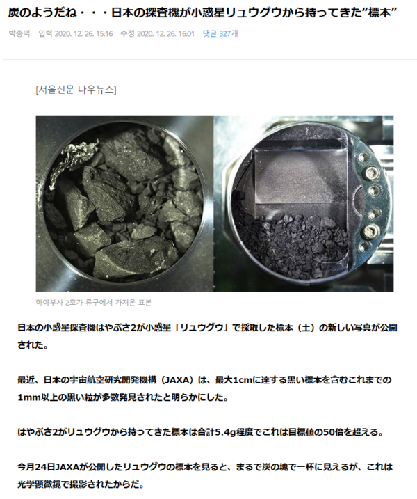 また発作の始まった韓国人「はやぶさ2のサンプルが炭のようだ…」「捏造ニポン…」「ただの石炭であることを祈る」「リュウグウは日本の領土、独島は韓国の領土」