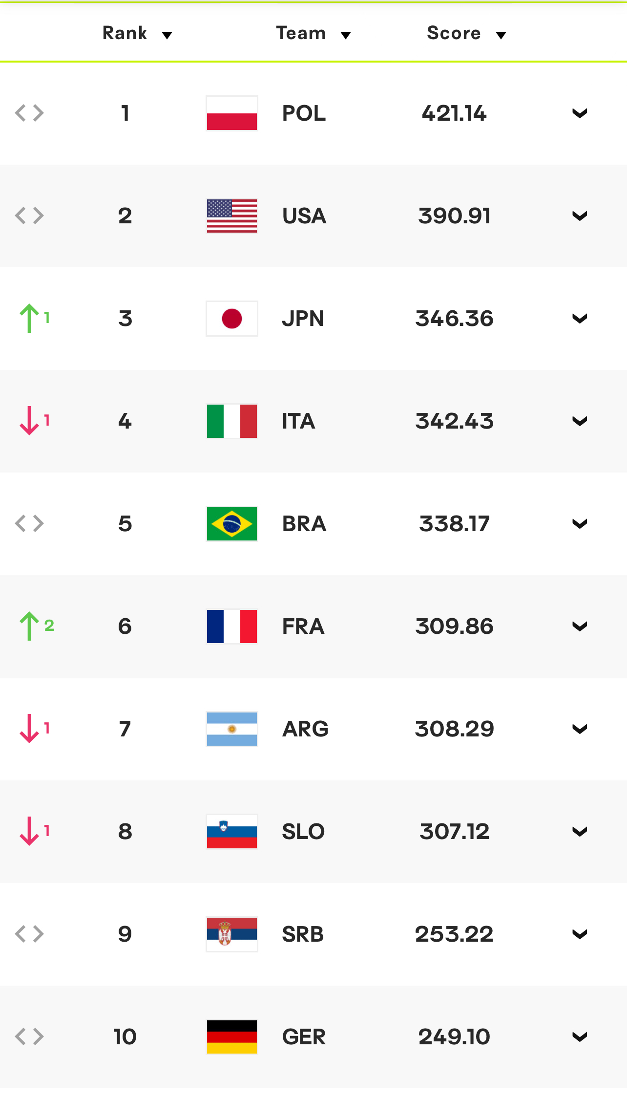 団体種目メダル期待度(期待値が高い順)