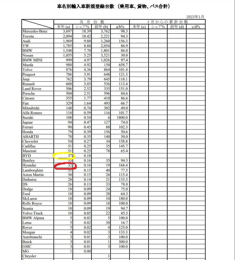 ベントレーよりも少なく韓国より遅く日本市場に進出したBYDにも後れを取るよwwwww