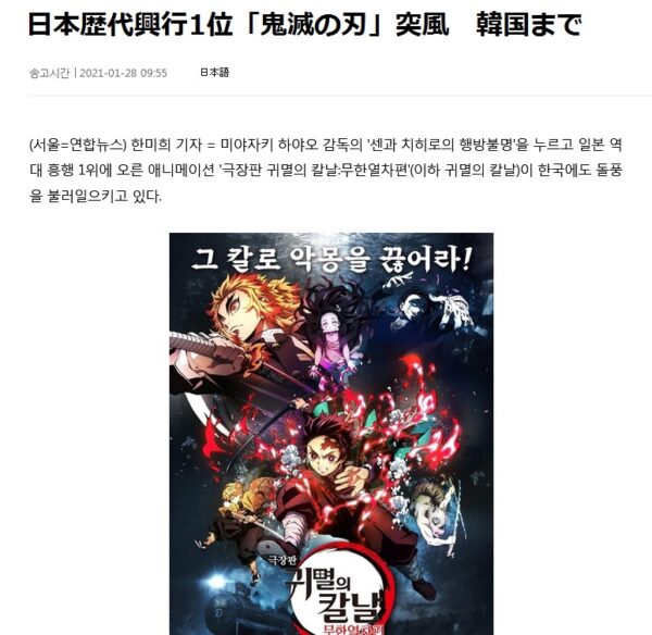 韓国人「日本映画“鬼滅の刃”韓国観客100万人突破!!!!!」→「この時局にすごすぎ(ブルブル)」