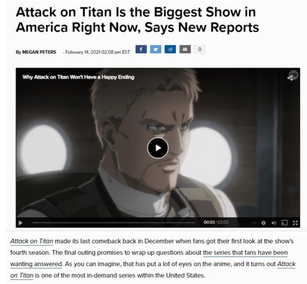 アメリカで錚々たるバラエティ番組、ドラマを抜いて視聴率1位を獲得した進撃の巨人などを保有している