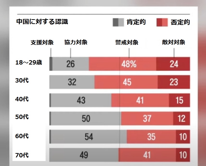 特に2~30代の中国好感度は最低値で、70%近く中国を敵対/警戒対象と認識している