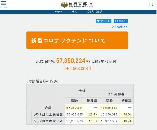 ※日本の職場、大学等で実施する職域接種数値は含まれていない