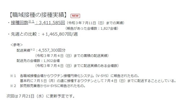 厚生労働省で職域接種何人接種したのかホームページに1週間ごとに1回ずつ更新する