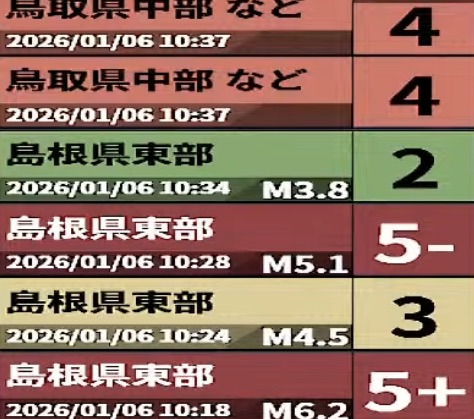6日10時18分頃、鳥取県・島根県などで最大震度5強を観測する地震がありました。今後の情報にご注意下さい。 https://t.co/uTfz9q5JSE #jishin