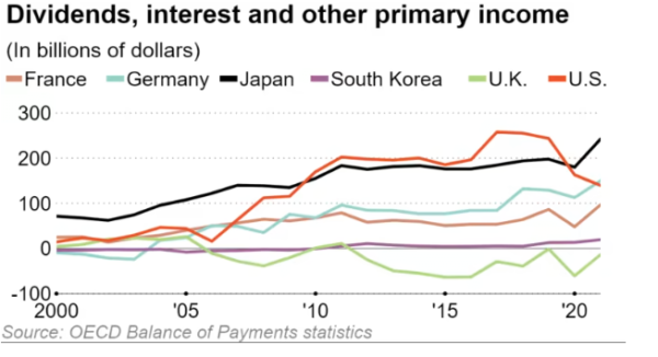 米国は、リーマンショック後の金融緩和、低金利時代に日本を追い抜くほど投資収益が急増したのに、高金利時には米国債の利払いが多くなって投資収益が悪化し、マイナス近辺まで低下しそうだ。