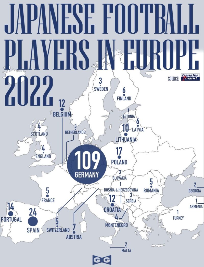 欧州で登録された日本サッカー選手は264人(ブルブル)