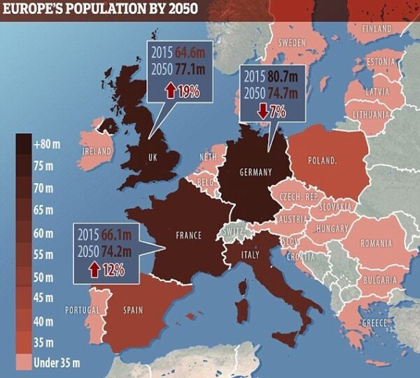 英国、フランス、ドイツの人口は2050年にはほぼ同じの7000万台に