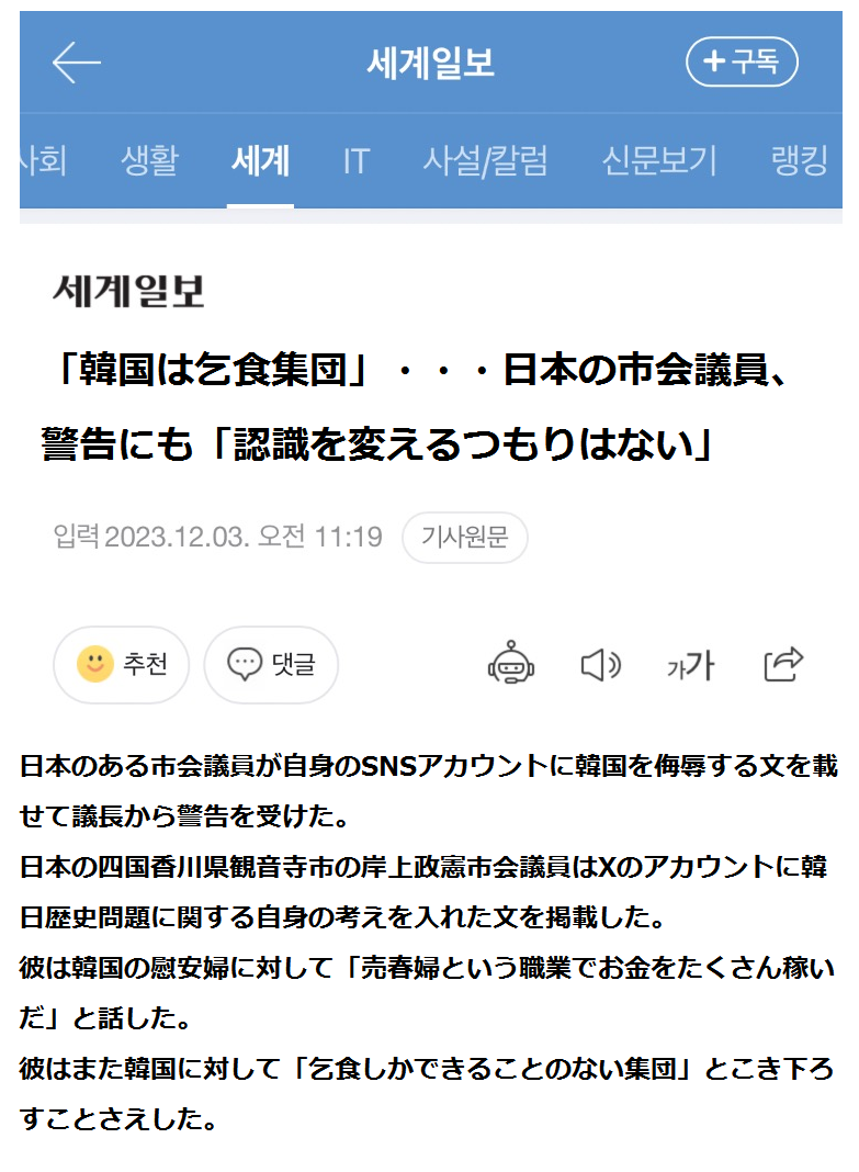 日本議員妄言「日本が韓国より上、韓国もそのように考える」