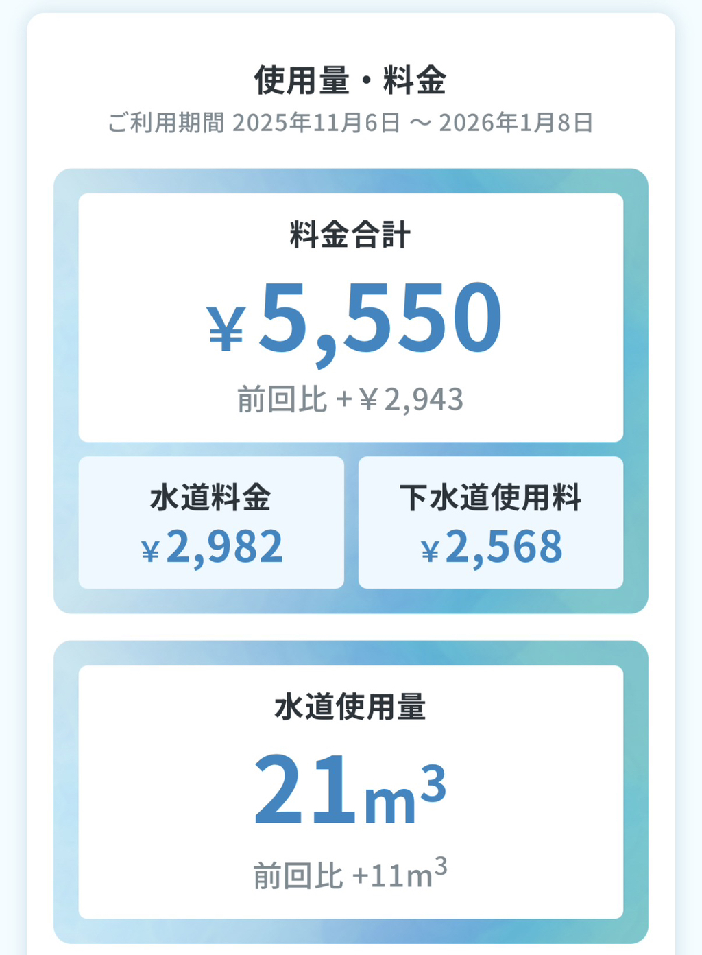 水道代は2か月ごとに払っているんだけど冬だからお風呂に頻繁に入ったせいで5500円(笑)