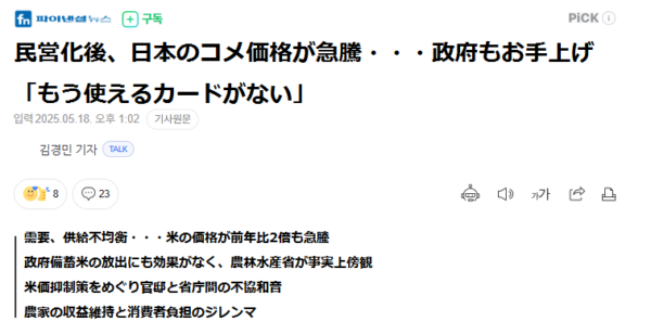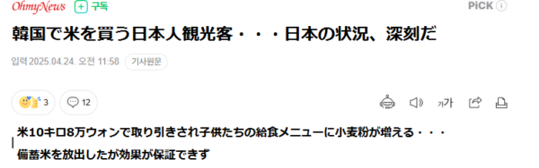 日本国内の輩や中国が日本の米価格暴騰煽ってるのはバレてるけど、韓国も煽ってんだろうなー