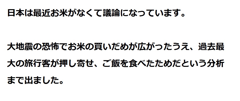 >観光客が日本のお米をすべて食べてしまっていると展開中<