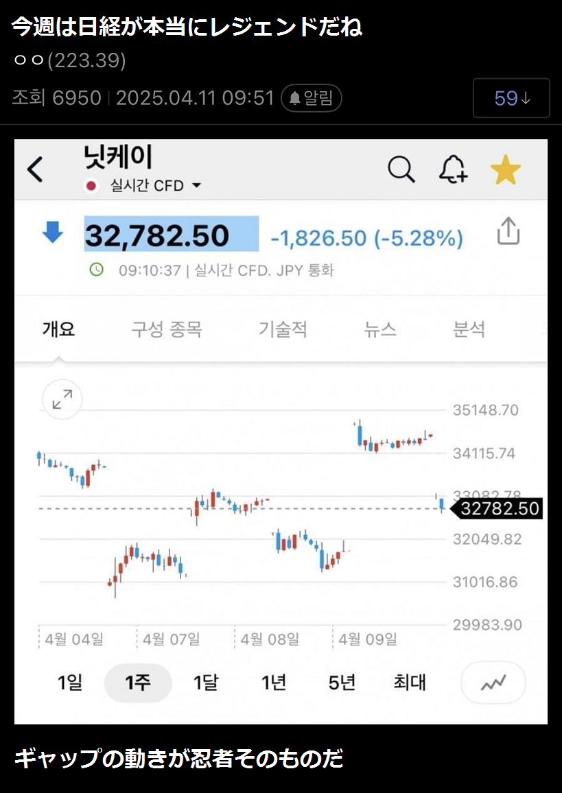 韓国人「今週の日本の日経のヤバさが分かるチャートをご覧ください・・・」→「ダイナミックすぎるw」「動きが速すぎてついていけないwww」「やはり忍者の国である」