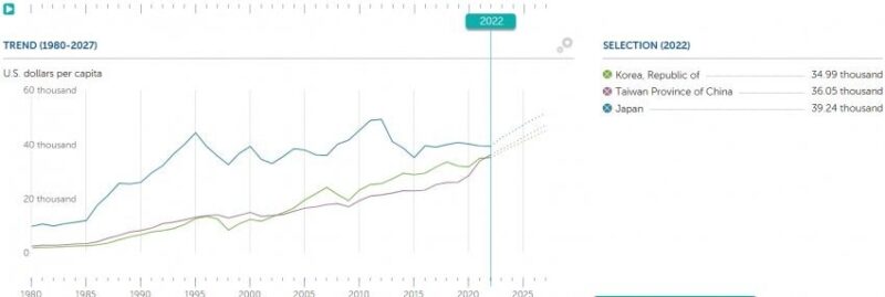 IMFは2025年に台湾が1人当たりGDP韓国を追い越すと予想するね