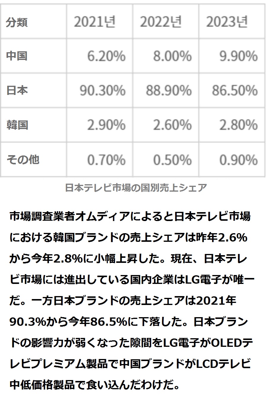 日本が好きなテレビパネルのほとんどがサムスンとLGのパネルだそうだ