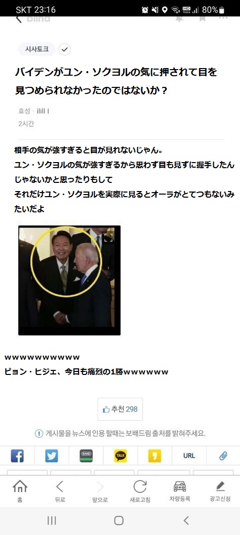 これ他のコミュで見たものなんだけど“ノールック握手”はユンの気が強くてバイデンが直接目をまともに合わせられない状況で発生したという話もしていた。