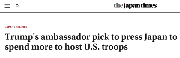 駐日大使指名者「日本は米軍駐留費を引き上げなければならない」