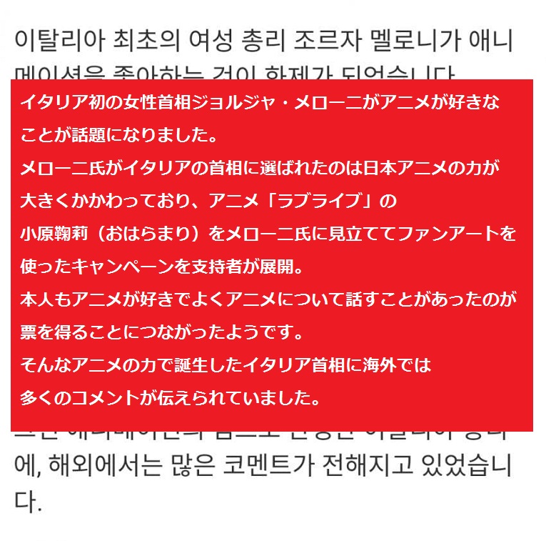 海外「また日本と同盟を組むのか…」 イタリアの新首相が大のアニメファンだった事が話題に