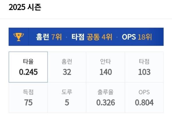 打率0.245 本塁打32 安打140 打点103 得点75 盗塁5 出塁率0.326 OPS0.804