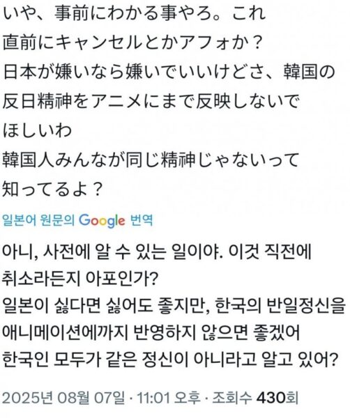 韓国あるあるだね。ある時は「日本アニメ大好き!!!」暫くして「やっぱり日本アニメ大嫌い!見たくもない!!!」ってもうやってること統合失調症と一緒だよ