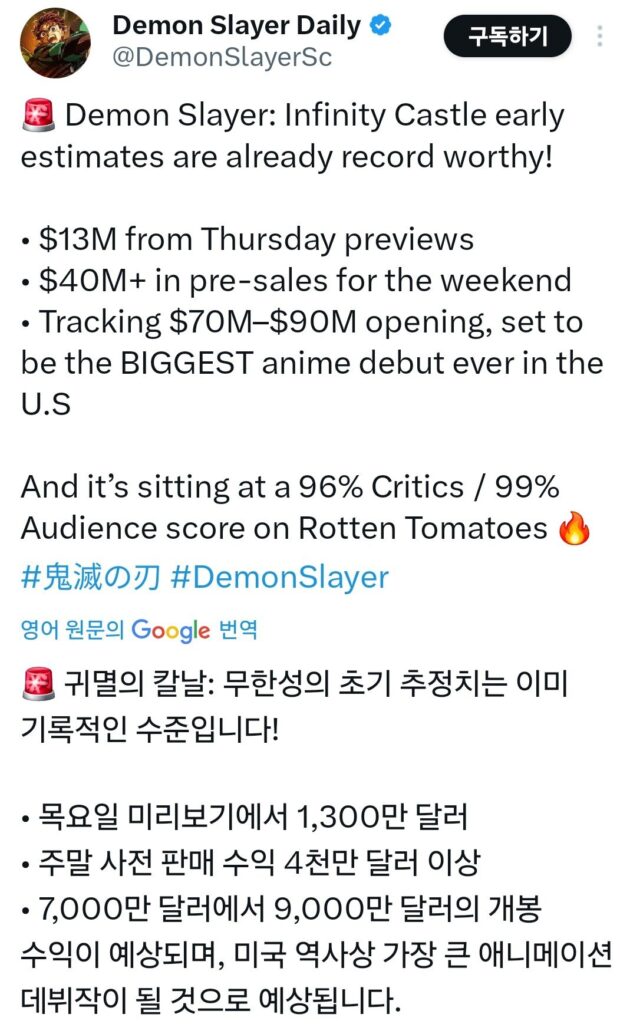 デーモンスレイヤーの興行収入の話はこうやって明確な数値で出てくるんだけど、韓国のデーモンハンターの明確な数値は出さないの?世界で大人気なんだろ?