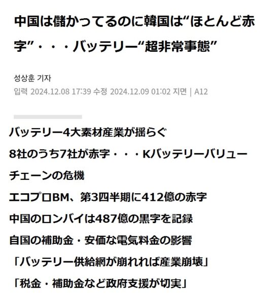 バッテリー業界だけだとでも思っているのか、マヌケ。愚民が民主主義ごっこをやってる間に軒並みどの業態も崩壊しとるわ。(笑)日韓併合前の地べた這い回ってた、あるべき姿に戻る時が来たようだな。自業自得だわ。バカのくせに調子に乗ってた代償はちゃんと払うがいい。日本の知ったことではない。(笑)