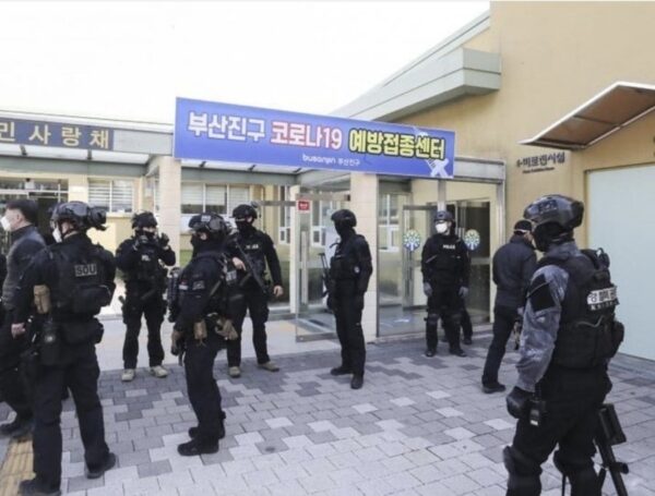 23日、釜山鎮区釜山市民公園内コロナ19ワクチン接種センターで警察特攻隊が対テロ鎮圧戦術模擬訓練をしている。