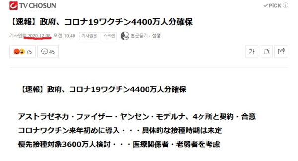 韓国紙「日本は全国民接種可能なワクチンを確保したが、韓国は?」