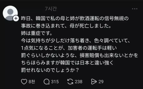 韓国人「日本でも報道され始めた韓国で日本人観光客の親子が飲酒運転の車にはねられた事故の内容をご覧ください・・・」→「本当に国の恥だ・・・」「本当に恥ずかしいし申し訳ない」「飲酒運転に対する法律をちょっと強化してくれ マジでこれは国の恥だ」