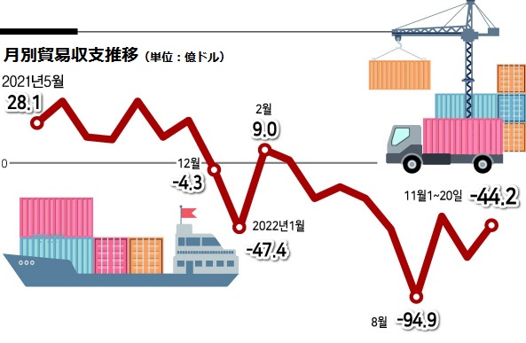 韓国の輸出が今月1~20日主力品目と主力市場である半導体と中国で30%ほど減少して今年貿易赤字累積額は400億ドルを記録した。これは国内貿易統計が作成され始めた1956年以来66年ぶりの最大値だ。