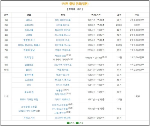 1位 ワンピース 1997年~連載中 98巻 4億8,000万部