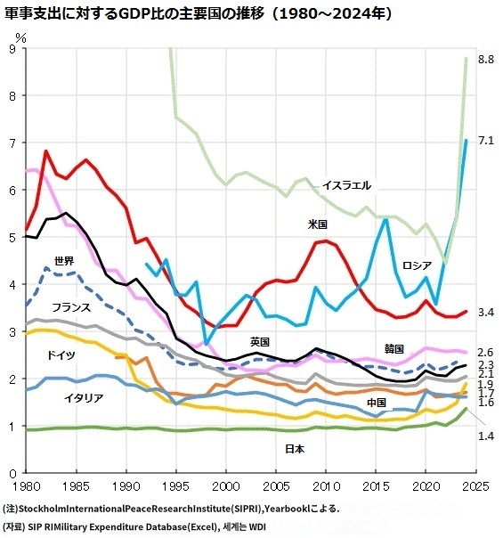 今年の四月の日経の記事で、日本の2025年度の防衛費はGDP比で1.8%って発表があったんだけど……数年前の数字を持ってきてるのかな?