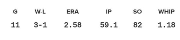 11試合3勝1敗 ERA 2.58 59.1イニング 被安打39 19失点 17自責 被本塁打6本