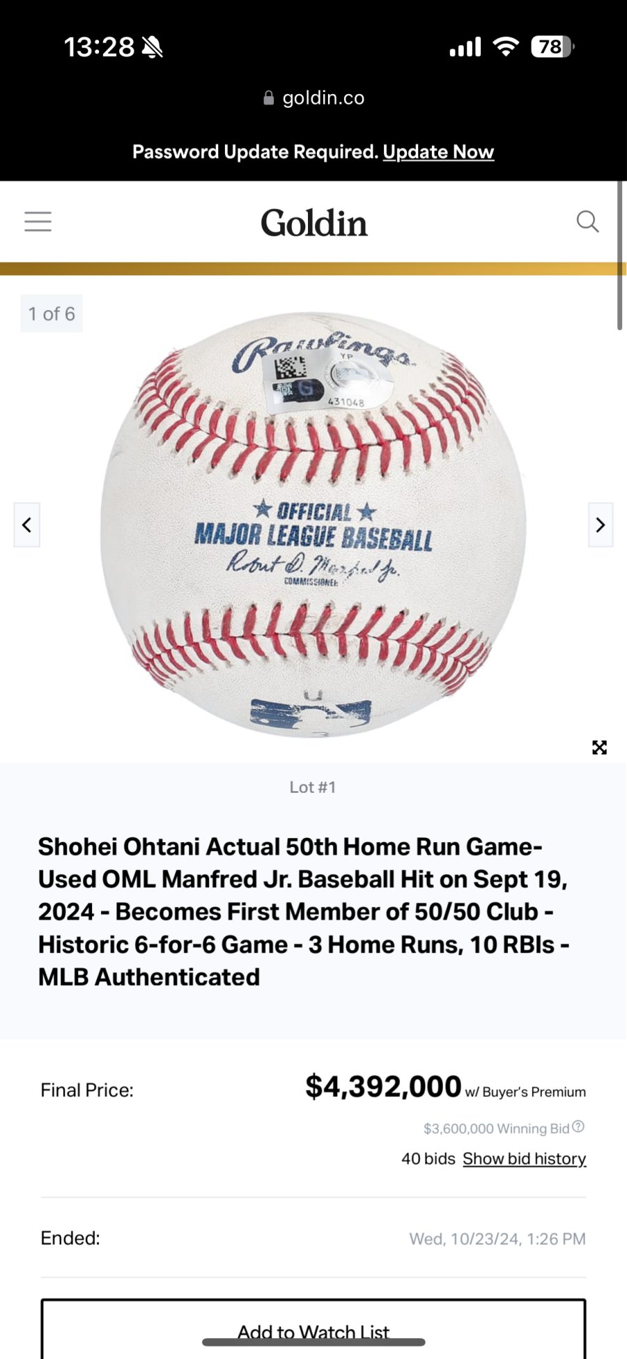 Final Sale Price on the Shohei Ohtani 50th Home Run Baseball: $4,392,000