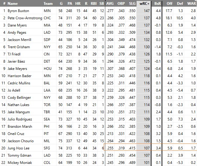 リアルタイム イ・ジョンフの成績(140打席以上の中堅手ランキング)