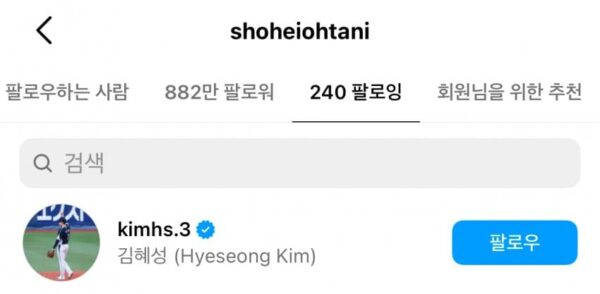 韓国人「日本の大谷翔平、キム・ヘソンのインスタをフォローwww」→「羨ましい、大谷と仲良くなれば一族の誇りじゃん」「大谷との相互フォローは600万ドルの価値がある」「めちゃくちゃ羨ましいわ!」