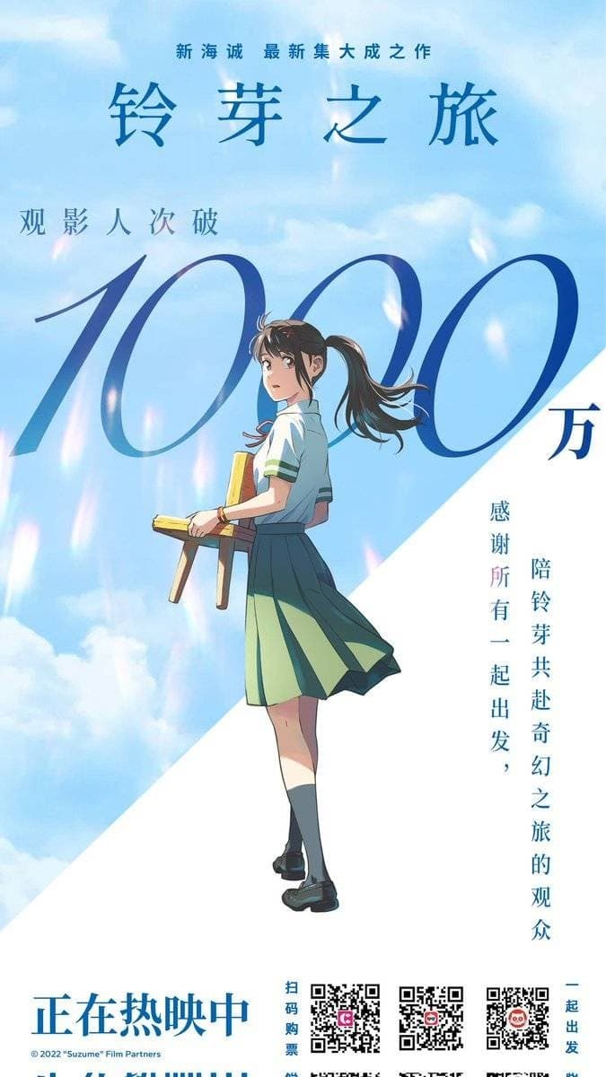 中国での『すずめの戸締まり/铃芽之旅』は、公開からわずか3日間で動員1000万人以上、興収は3.4億元(約65億円)となりました。その勢いと、他国の作品への愛情に驚くばかりです。劇場に足を運んでくださった皆さまに、心より感謝です! pic.twitter.com/zkVHtVxTZM