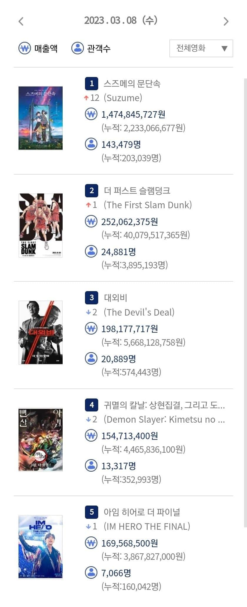 すずめの戸締まりの14万3000人は日本アニメ韓国公開初日成績歴代1位である