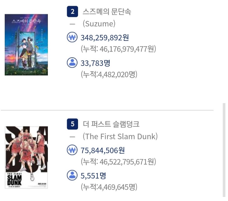 韓国人「日本映画すずめの戸締まり、韓国で新しい歴史を書く 興行成績35日連続1位達成!」→「」