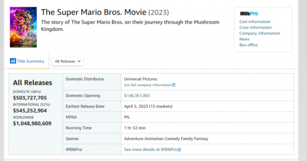 スーパーマリオ映画累積売上10億ドル、名探偵ピカチュウの2倍