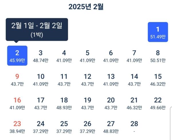 1月末の平日の日本の東京と韓国のソウルホテルの価格(ホテル最安値検索)