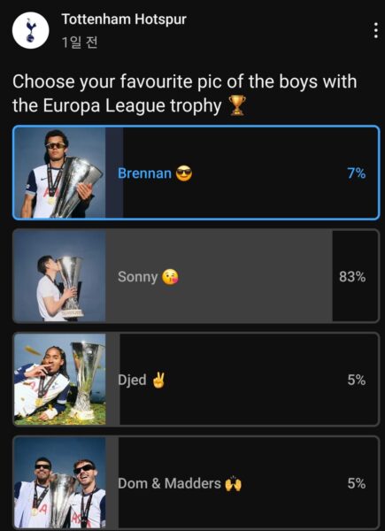 韓国人「ソン・フンミン、トッテナム公式YouTubeアンケートで圧倒的1位達成」→「誰でも投票できるからあまり信頼性があるわけではない」「韓国人もたくさん押したんだろうね でも韓国人だけであんな数値は出ないよ」「もうトッテナムGOATである」