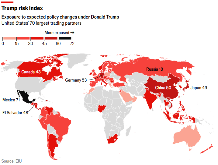 EIUが「トランプ危険指数」と呼ぶこの順位は、貿易、セキュリティ、移民に対する米国の政策に対する国家の露出に基づいています。