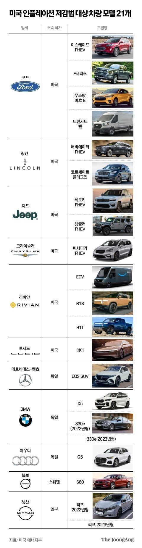 IRAにともなう税制恩恵7500ドル(約1006万ウォン)を受ける車種は全部で21車種だ。米国の完成車メーカーは13車種で最も多い。新生メーカーリビアン(3車種)ルーシッド(1車種)も含まれた。